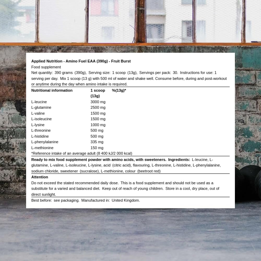 يحتوي كل مكيال على 11 جرام من الأحماض الأمينية، منها 9 جرام أحماض أمينية أساسية لا يستطيع الجسم تصنيعها بنفسه، بالإضافة إلى 6 جرام من الأحماض الأمينية متفرعة السلسلة بنسبة متوازنة، و 2 جرام من الجلوتامين لدعم التعافي وتقليل الإجهاد العضلي.