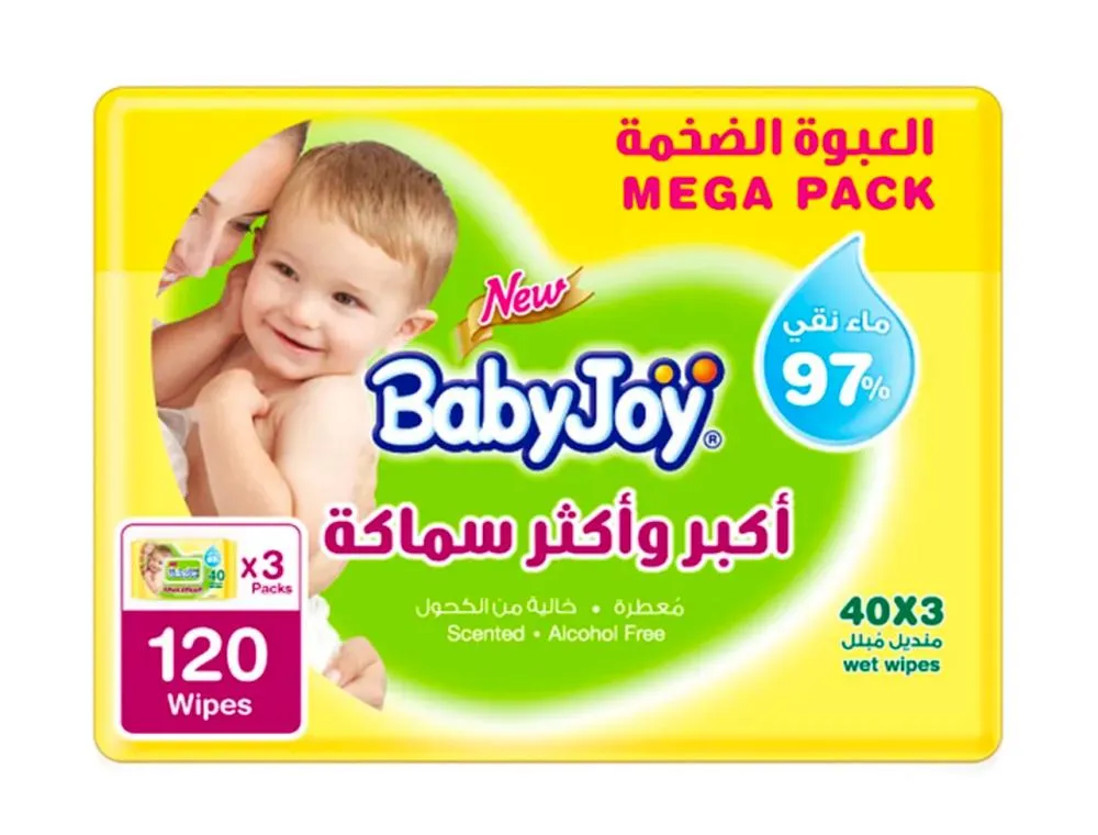 احصلي على نظافة فائقة لطفلك مع مناديل بيبي جوي المبللة والسميكة. تحتوي على 97% مياه نقية، خالية من الكحول، وتأتي في عبوة توفيرية تضم 120 منديلا معطرا.