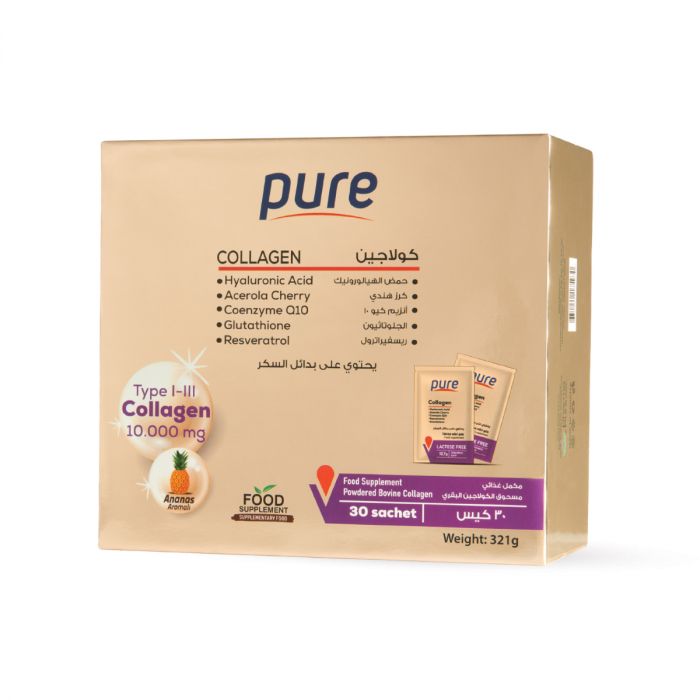 بيور كولاجين هو مكمل غذائي مصمم خصيصًا لدعم صحة البشرة والشعر من الداخل، بتركيبة متقدمة تجمع بين كولاجين ببتيدات عالي التركيز ومجموعة من العناصر الداعمة للجمال. يحتوي كل ساشيه على 10,000 مجم من كولاجين ببتيدات (النوع الأول والثالث)، وهي الأنواع الأكثر ارتباطًا بصحة الجلد ومرونته.