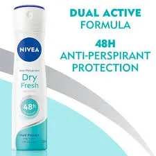 نيفيـا مزيل عرق للنساء بخاخ دراي فريش يوفر حماية فعالة ضد التعرق مع عناية فائقة بمنطقة تحت الإبطين. يعمل هذا المنتج على التخلص من رائحة العرق المزعجة بشكل قوي وفعال مع تنعيم وتفتيح البشرة لمنحها مظهراً متألقة ومتجانساً. تركيبة نيفيا دراي فريش تمنح حماية تصل إلى 48 ساعة مع الحفاظ على نعومة البشرة وإحساس بالانتعاش طوال اليوم. عطره الأنيق يدوم طويلاً ويزيد من شعورك بالثقة، كما تم اختباره من قبل أطباء الجلدية لضمان ملاءمته لجميع أنواع البشرة بما فيها الحساسة. مناسب للاستخدام اليومي سواء في العمل أو المناسبات أو أثناء النشاطات اليومية، ويجمع بين الفعالية والراحة في آن واحد.